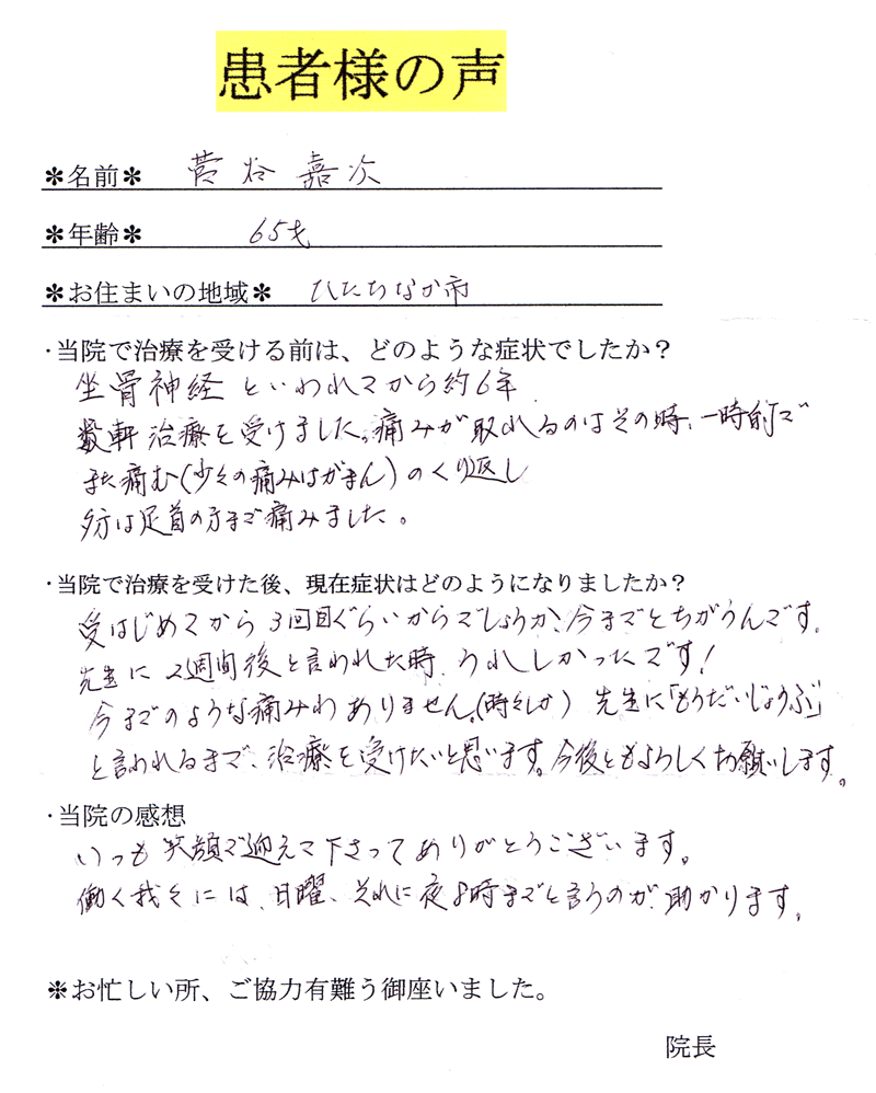 手術が必要と言われたヘルニアが坐骨神経痛に発展してしまいましたが、施術1回目から効果をしっかりと実感でき、現在は痛みの症状がありません。(ひたちなか市/50代/男性/坐骨神経痛)