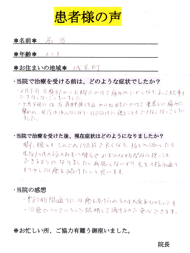 処方された痛み止めもブロック注射も一時的でまた痛くなり車の運転も苦痛でした。あいのて治療院を紹介され週2日治療を受けているうちにシビレ、痛みともにやわらぎました。
