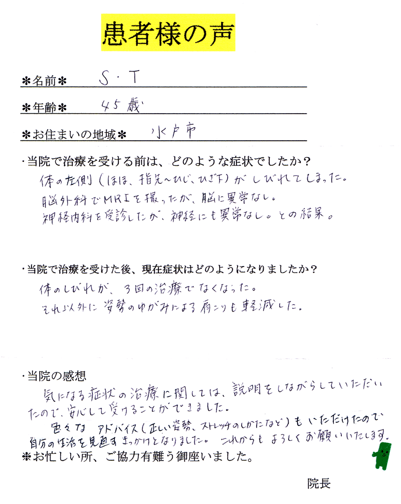 あいのて治療院での3回の治療で、体のしびれがなくなった。それ以外に姿勢のゆがみによる肩こりも軽減した。説明をしながら治療していただいたので、安心できました。