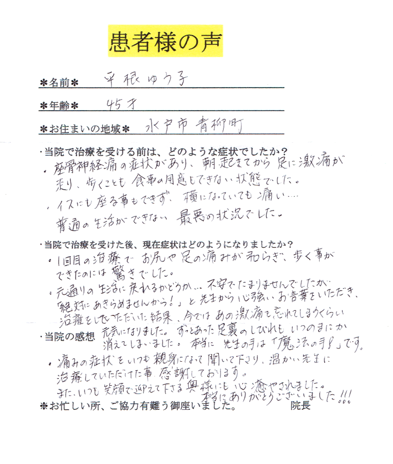 イスに座る事もできず、横になっていても痛い…普通の生活ができない最悪の状況でした。1回目の治療でお尻や足の痛みが和らぎ、歩く事ができたのは驚きでした。