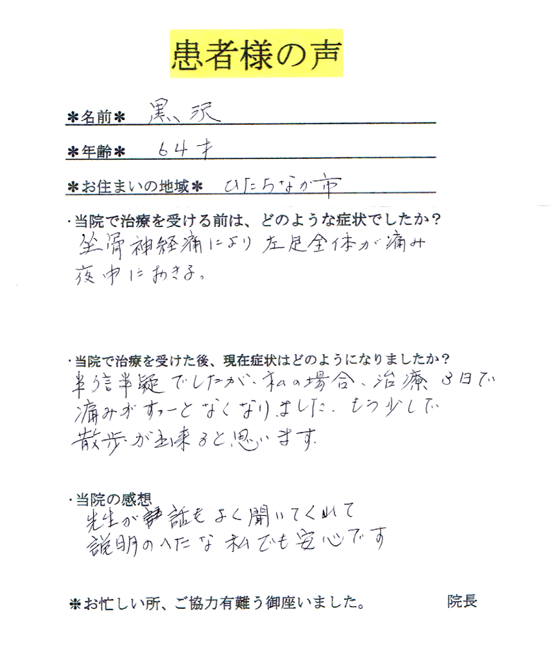 坐骨神経痛で尻から右足くるぶしまで激痛で寝たきりでしたが、施術5~6回で歩けるようになりました。