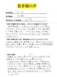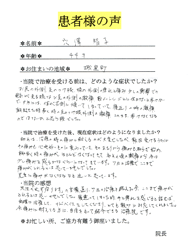 • 先生の治療方法が的確で、腰痛に対して知識が豊富で熱心に勉強されており、絶対に治してくれると信頼ができ、知人にも安心して紹介できると思いました。