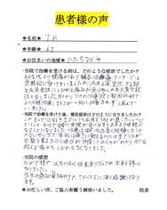 先生の「必ず治ります」の言葉通り、7回の治療を終えた今、ここまで痛みがとれるとは思いませんでした。寝違えてしまった時、手に痺れを感じると話せば的確に治療して、アドバイスをしてくださり、とても親切に対応してくれました。
