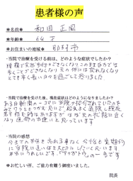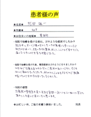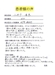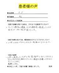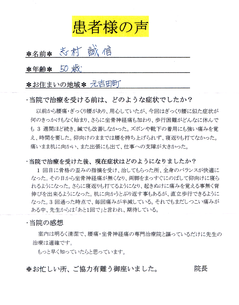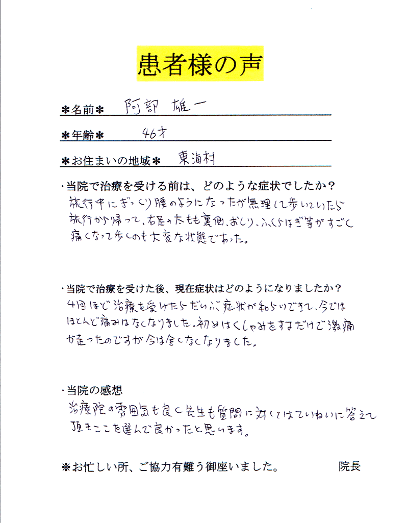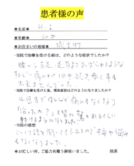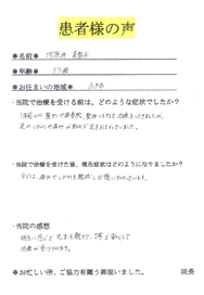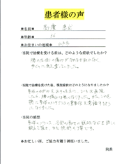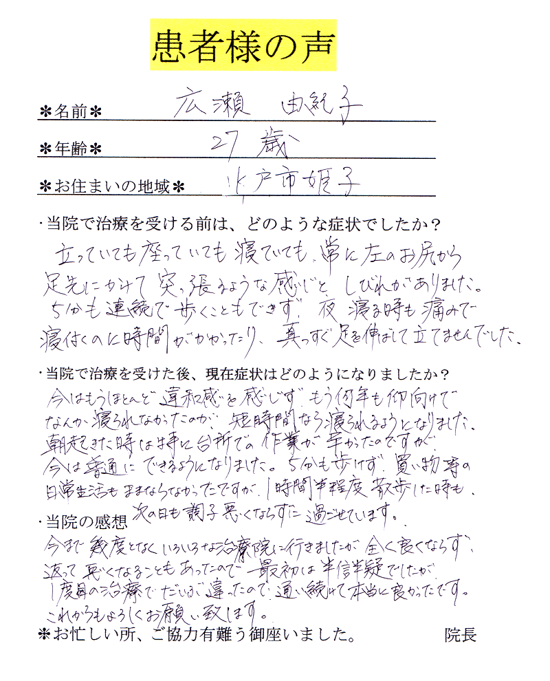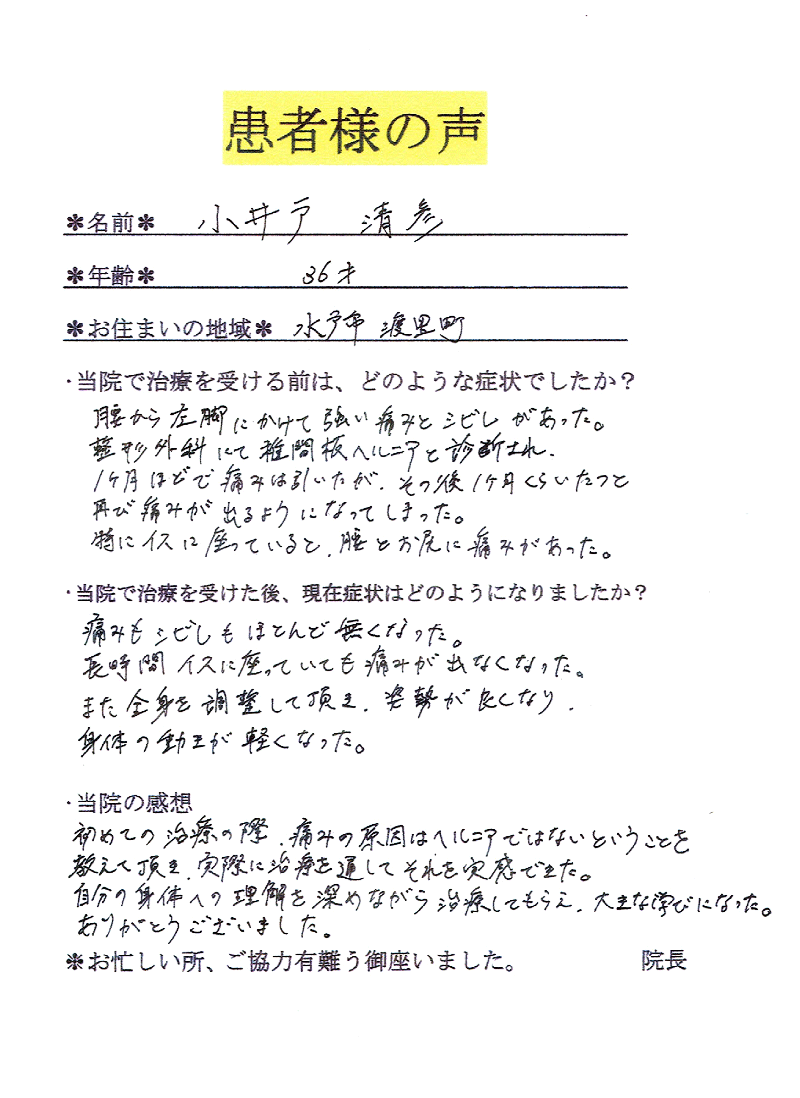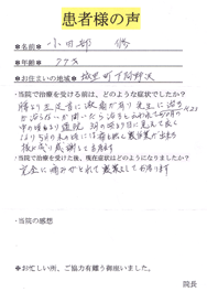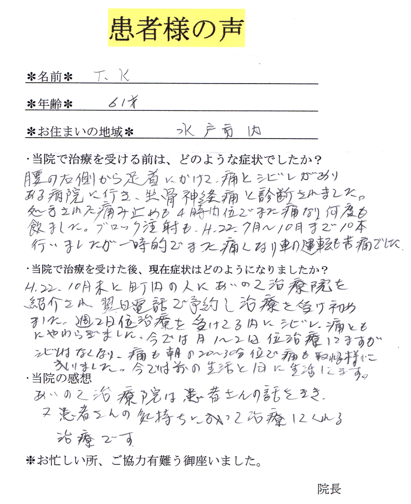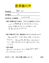 手術が必要と言われたヘルニアが坐骨神経痛に発展してしまいましたが、施術1回目から効果をしっかりと実感でき、現在は痛みの症状がありません。(ひたちなか市/50代/男性/坐骨神経痛)