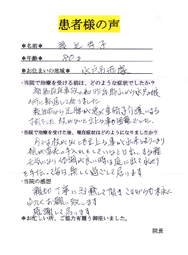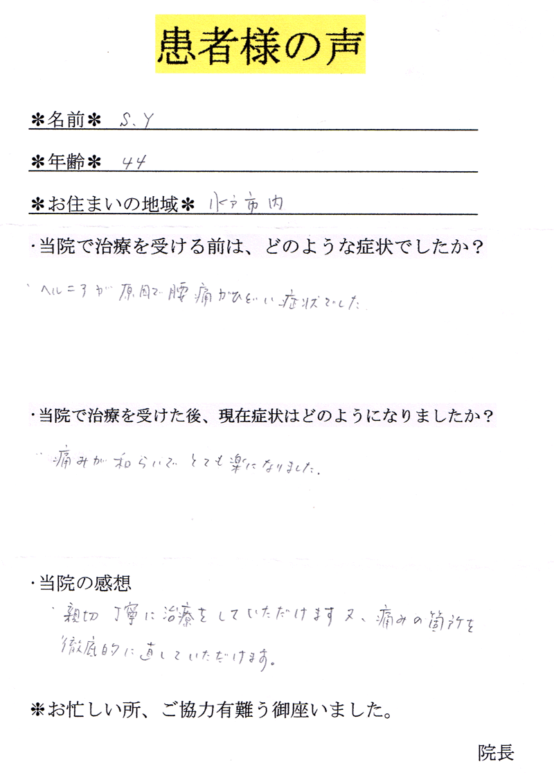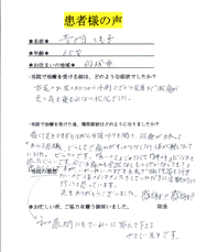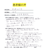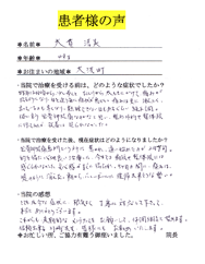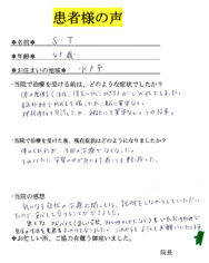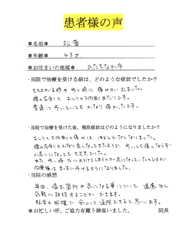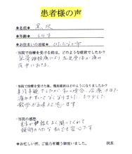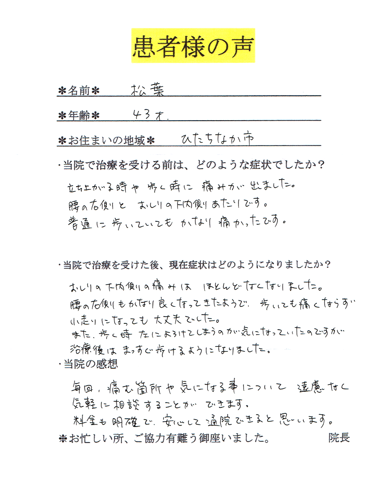 何年も色々な所を通いましたが、あいのて治療院で痛みが無くなり身軽に過ごせるようになって本当に感謝しています。(ひたちなか市/30代/女性/腰痛)